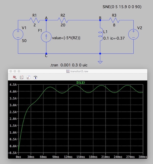 Con LTSpice ho verificato l'andamento della corrente a partire dall'istante di chiusura del tasto introducendo il valore iniziale della corrente nell'induttore. L'istante 0 del grafico prodotto dalla simulazione corrisponde all'istante 0,1 s del precedente grafico. Il segno meno nella definizione dei generatore dipendente di corrente è dovuto al fatto che LTSpice considera positivo il verso della corrente su R2 opposto a quello del testo