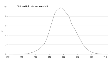 Poiché l'occhio non è ugualmente sensibile a tutte le lunghezze d'onda dello spettro elettromagnetico visibile, i valori dell'illuminante per una data lunghezza d'onda sono moltiplicati per il fattore di visibilità, Vλ, relativi a quella lunghezza d'onda. Si ottiene, per l'illuminante D65 , la curva di figura fs.3