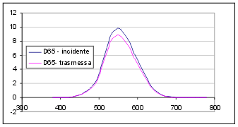 La trasmissione luminosa riguarda il comportamento di una vetrata rispetto alla luce (cioè, come detto, le radiazioni elettromagnetiche comprese tra 400 ed i 760 nm). L'andamento dell'energia emessa da una sorgente all'interno di quell'intervallo è dipendente dalla natura della sorgente e dalla sua temperatura. Nello studio delle proprietà ottiche e colorimetriche si usano gli illuminanti standard. Per determinare la trasmissione luminosa si usa il D65, la cui emissione spettrale è mostrata dalla curva di figura.