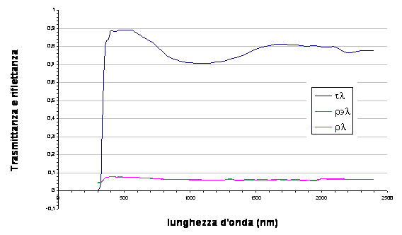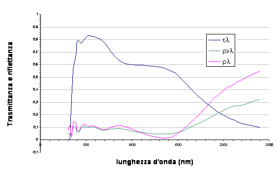 Le figure fs.12 ed fs.13 sono due esempi con vetri diversi. Il primo è relativo ad un vetro chiaro; il secondo ad un vetro a controllo solare. La curva mediamente più bassa è la radiazione trasmessa e, come si può notare dall'area sottesa, il vetro solare lascia passare meno energia, a tutte le lunghezze d'onda ma, in particolare, nel campo dell'infrarosso (da 760 a 2500 nm)