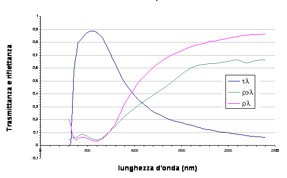 Nelle figure precedenti, oltre alla trasmittanza spettrale compaiono altre curve, le riflettanze spettrali ( ρλ , ρλ' ) dei delle due facce del vetro, necessarie per poter determinare con il calcolo, condotto in base alla norma EN 410, la trasmissione e, come vedremo, il fattore solare, di vetri composti (doppi vetri e tripli vetri).