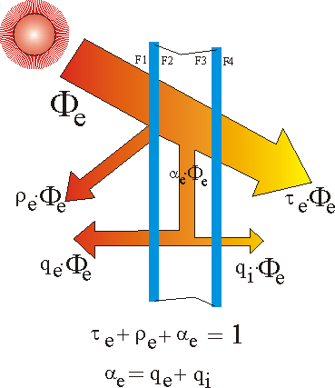 dove τ1 e τ2 sono le trasmittanze spettrali dei due vetri componenti, e ρ1b e ρ2 le riflettanze spettrali sul lato opposto a quello incidente del vetro esterno e della parte incidente del vetro interno.