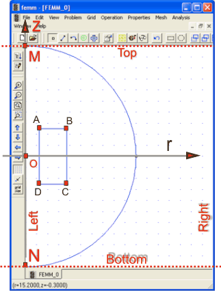 Definendo il problema a simmetria assiale l'asse di simmetria r = 0 è tracciato verticalmente ed il problema è definito nella regione