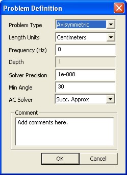 Per definire che la geometria del sistema fisico è a simmetria assiale e che si tratta di un problema di magnetostatica, si sceglie il menu Problem e nella finestra che appare Problem definition si seleziona: