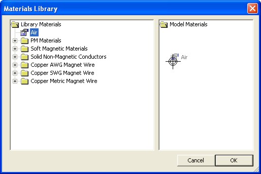 Si trascinano nel box di destra con il mouse (drag & drop), i materiali che si trovano nel box di sinistra che li raccoglie in una cartella associata al progetto. Nel nostro caso i materiali sono l'aria (Air) ed il filo di rame AWG 18 che si trova nella cartella Copper AWG Magnet Wire. Fatto ciò si clicca su OK.