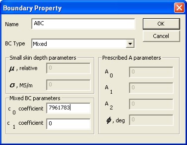 Si sceglie il menu Property/Boundary e nella finestra che compare si clicca sul pulsante Add New Property. Nel campo Name della nuova finestra si scrive, ad esempio, ABC (Asymptotic Boundary Condition) e, nel campo BC Type si seleziona Mixed .