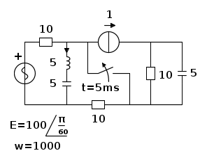 Si passa a scrivere l'equazione differenziale usando la KVL alla maglia di sinistra, ricordando che, per usare un nuovo riferimento per il tempo, ripartendo da zero alla chiusura dell'interruttore, si ha una e(t) sfasata di 5ms. Dunque si ha: