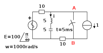 La sovrapposizione degli effetti avrebbe portato subito a vedere che la soluzione era in realta' molto piu' semplice. Bastava notare che la chiusura dell'interruttore non veniva ad influenzare il regime permanente sinusoidale grazie alla risonansa del ramo LC, e di conseguenza, la tensione ai capi dell'interruttore, risulta dipendente unicamente dal generatore di corrente ed e' indipendente da quello di tensione.