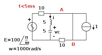 A questo punto si effettua il calcolo delle condizioni a regime per t<5ms. Con l'interruttore chiuso l'unica parte della rete da studiare e' quella di sinistra.