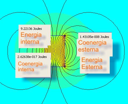 Sono indicate: energia e coenergia totali e le energie esterne ed interne al magnete. L'energia è concentrata nei traferri; nei gioghi e colonna è trascurabile.