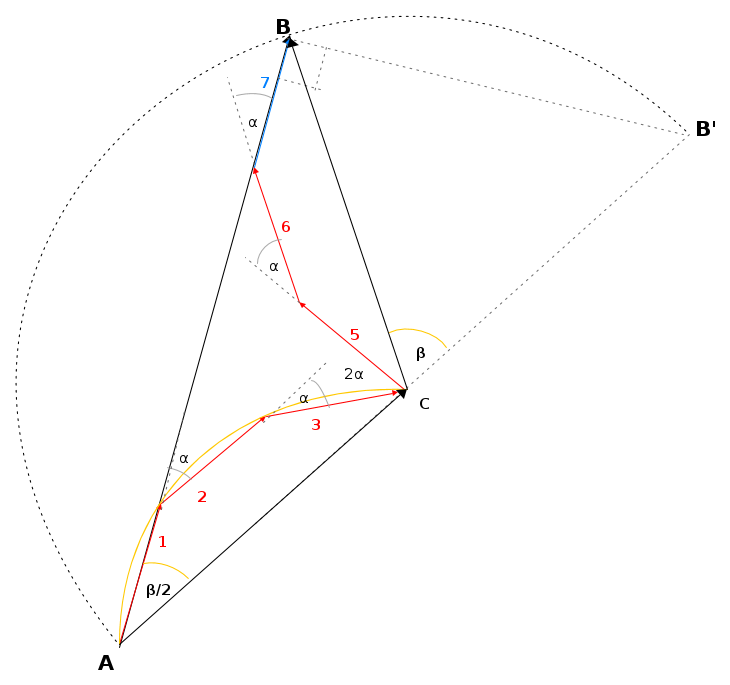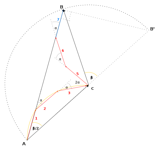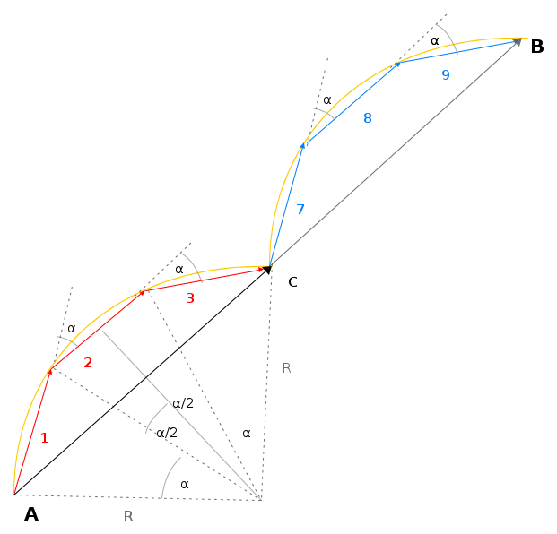 AC e CB rappresentano le tensioni parziali delle due serie di conduttori e sono uguali in modulo ed in fase; la loro somma AB corrisponde alla tensione ai capi dell'avvolgimento. AC è il doppio della corda della circonferenza di raggio R. L'angolo al centro vale qα. Si ha allora: