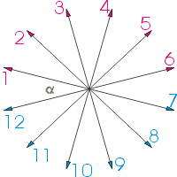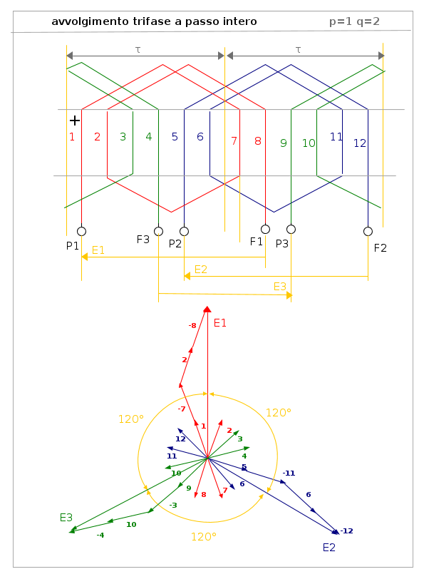 Tacciamo il diagramma vettoriale delle tensioni dei conduttori di un avvolgimento a passo intero. Si suppone per semplicità un conduttore per cava e si usano 3 conduttori per polo (q=3). Il valore efficace della tensione di ogni conduttore vale E, come mostrato in precedenza ; α è l'angolo elettrico di sfasamento tra le tensioni di conduttori in cave adiacenti. I conduttori che distano un semipasso polare sono collegati in modo che le loro tensioni siano in fase. La tensione della serie dei conduttori 1, 2, 3 ha lo stesso valore ed è in fase a quella della serie dei conduttori 7,8,9.