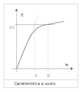La tensione indotta dipende dal flusso magnetico, oltre che dal tipo di avvolgimento, dal numero di conduttori e dalla velocità di rotazione. Il flusso magnetico si regola intervenendo sulla corrente di eccitazione. Per bassi valori dell'induzione magnetica, quibdi del flusso, la riluttanza del ferro è trascurabile rispetto a quella del traferro e la corrente di eccitazione serve esclusivamente per la caduta di tensione magnetica sul traferro. Poiché la riluttanza del traferro è costante, c'è proporzionalità diretta tra tensione indotta e corrente di eccitazione. Quando il ferro entra in zona di saturazione, la caduta di tensione magnetica nel Ferro non è più trascurabile e cresce al crescere del flusso, quindi all'aumentare della corrente di eccitazione. La caratteristica a vuoto E,Ie assume allora l'andamento di figura