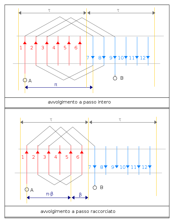 Un avvolgimento è costituito dalla serie di più conduttori posti in cave diverse. La tensione ai suoi capi non corrisponde alla somma aritmetica dei valori efficaci delle tensioni dei singoli conduttori, ma alla somma geometrica. E' a passo intero, quando i conduttori di una cava sono collegati con i conduttori della cava che dista esattamente la lunghezza di un polo, o a passo raccorciato se distano meno di un semipasso.