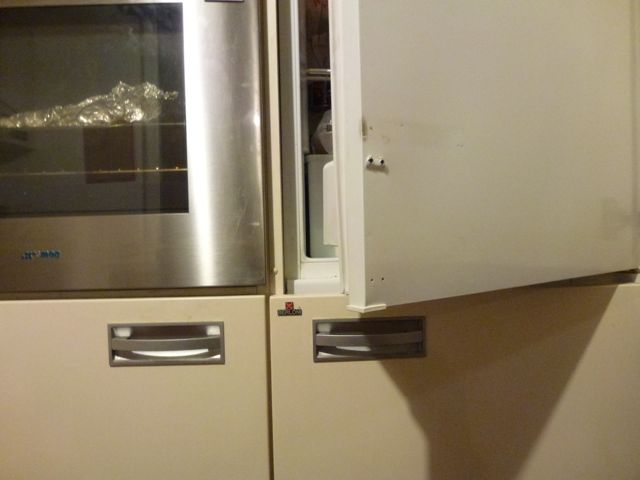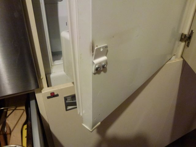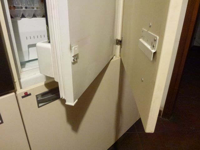 Non so di preciso chi incolpare (costruttore, venditore, installatore) ma qualcuno ha commesso un "piccolo errore"; quello di non pensare allo spessore della lamiera della porta del frigo, al fatto che la stessa, caricata con bottiglie d'acqua, di latte, di vino, ed altri alimentari, assume una massa che si oppone con maggior forza alle accelerazioni delle numerose aperture giornaliere, con conseguente sollecitazione della lamiera proprio nella zona indebolita dalle autofilettanti, e rottura della medesima per lo spessore inadeguato.