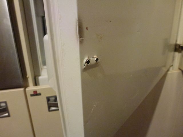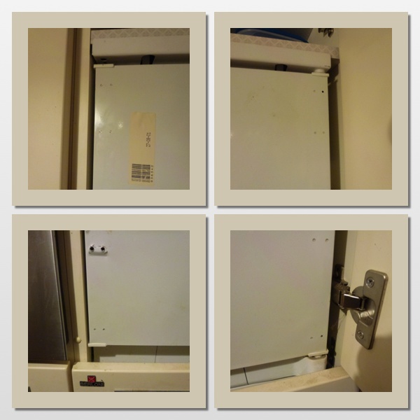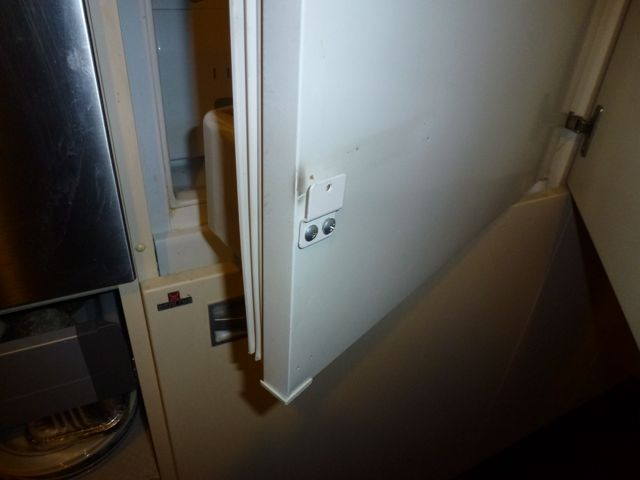 I fori ospitavano le due viti autofilettanti che fissavano alla porta del frigo una piccola staffa metallica, che agganciandosi e scorrendo nella guida della porta laccata, permetteva l'accesso all'interno del frigo con una sola manovra e non in due consecutive.