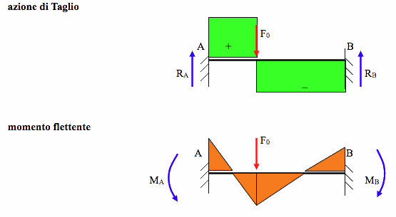 Nel primo di essi si nota una INVERSIONE DEL SEGNO dell’azione di taglio, in corrispondenza al punto di carico: nell’analogia ciò corrisponde alla sezione di una linea dove avviene l’ INVERSIONE DELLE CORRENTI. Come a dire che il carico, elettricamente parlando, è alimentato in parte dal punto A (a sinistra) e in parte dal punto B (a destra).