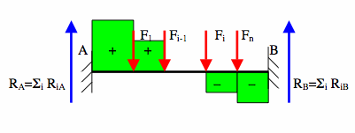 Analogia: la sezione di inversione si ha nel punto di alimentazione del carico Fi-1, il quale sarà alimentato in parte da A e in parte da B. Valgono analoghe considerazioni per i momenti flettenti: nel punto di inversione, essendo il taglio nullo, avranno un massimo relativo (sottoforma di cuspide).