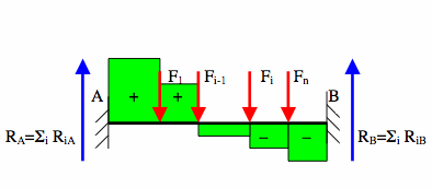 Avremo perciò una zona, intermedia fra due carichi, in cui l’asta non è sottoposta ad azione tagliante. Nell’analogia corrisponde ad tratto di una linea in cui non passa corrente. Con riferimento al grafico, sarebbe come dire che i carichi fino a Fi-1 sono alimentati da A mentre i carichi da Fi fino a Fn sono alimentati da B.