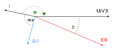 dove U è la tensione di rete. Quando le due tensioni sono perfettamente in fase, si chiude l'interruttore del parallelo. In queste condizioni la corrente è nulla e non c'è alcuno scambio di potenza tra macchina e rete. La potenza richiesta alla turbina è esclusivamente quelle delle varie perdite nel ferro e per attriti meccanici.