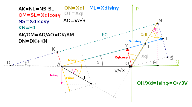 Il punto N, estremo di E0, indica anche la potenza complessa erogata dalla macchina, cioè potenza attiva e reattiva in un piano di riferimento.