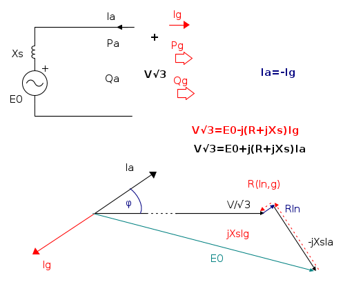 Schematizziamo una fase di macchina sincrona a poli lisci considerata come generatore, trascurando la resistenza.