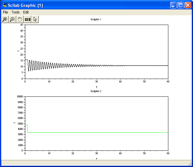 Dopo aver caricato il file detto in Scicos, i grafici si ottengono con Simulate->Run. Con Simulate − Eval si possono variare i parametri, ad esempio b. Si può vedere che se b=0 le oscillazioni continuano all'infinito.