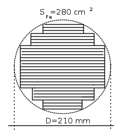 La sezione del nucleo è a gradini. La massima larghezza della sezione è di 200 mm; il diametro del cerchio circoscritto di 210 mm. La distanza tra gli assi delle colonne è di 410 mm, lasciando un canale di 30 mm tra gli avvolgimenti AT di due colonne adiacenti (190x2+30=410).
