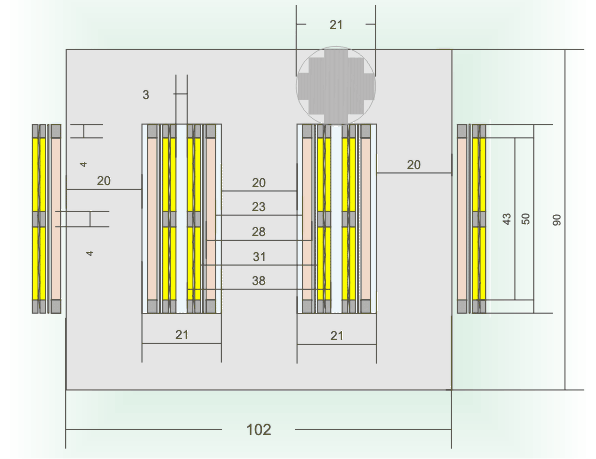 In totale lo spessore del rame aumenta di 4 mm; è stato però eliminato il canale intermedio di raffreddamento di 6 mm. Lo spessore complessivo è allora ridotto di 2 mm. Il diametro esterno dell'avvolgimento risulta pertanto diminuito di 4 mm. Quindi