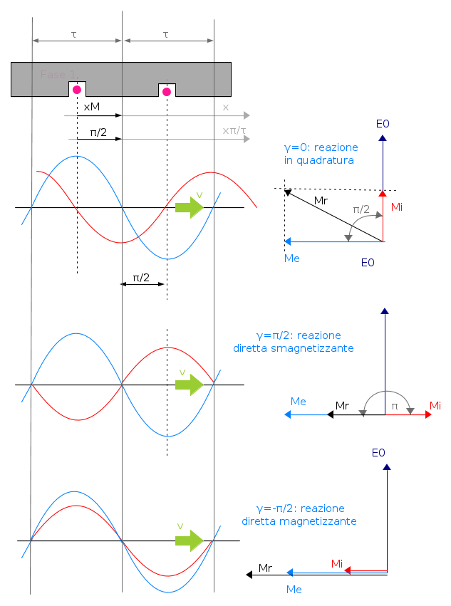 Per facilitare le considerazioni, immaginiamo che l'avvolgimento di statore, a passo intero, sia costituito da conduttori concentrati in una cava per polo. Consideriamo la fase 1; in corrispondenza ad una cava che ne contiene i conduttori, è fissata l'origine dell'ascissa x. Quando, durante la rotazione del rotore, la cui velocità periferica è rappresentata dalla freccia verde chiaro v, in corrispondenza di tali conduttori si presenta il massimo del campo induttore o, ciò che è lo stesso, un asse polare, ad esempio un Nord come in figura, nell'avvolgimento è massima la tensione indotta a vuoto. Ciò significa che