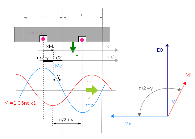 Un osservatore fisso rispetto allo statore, rappresentato dalla freccia verde scuro F, vedrà di conseguenza la sinusoide della reazione di indotto, che sta spostandosi alla stessa velocità del rotore, ritardare dell'angolo