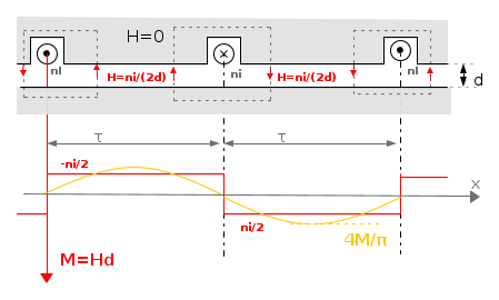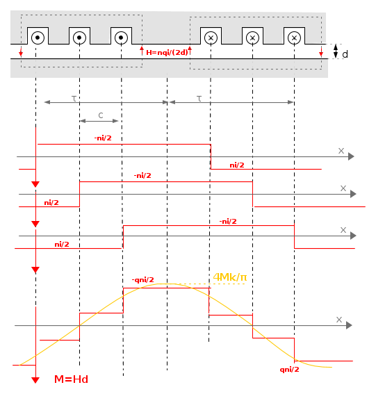 La totale forza magnetomotrice ni è dunque spesa nei due tratti di traferro. Nella figura ne è rappresentato l'andamento lungo la periferia del traferro. E' alternato rettangolare di ampiezza ni / 2. L'asse delle ordinate è per questo orientato verso il basso; sono dunque considerati positivi i valori della tensione magnetica che dà luogo a flussi uscenti dallo statore (indicati dalle frecce rosse).