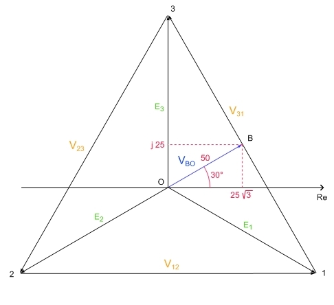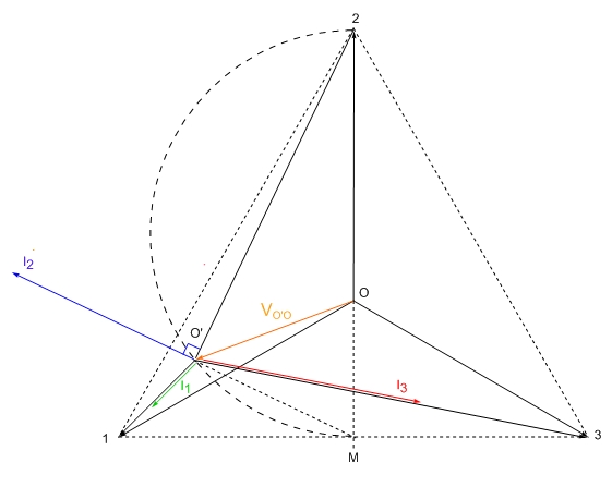 Visto che R1=R3, la somma di I1 e di I3 dovrà passare per M (punto medio della diagonale 1-3), e così anche il prolungamento della I2 = -(I1+I3) ... il centro stella O' sarà di conseguenza obbligato a trovarsi in una posizione tale da formare con i punti 2 e M un triangolo rettangolo (retto in O') e quindi a seguire la semicirconferenza che passa per il punto medio M di V13 e il punto 2.