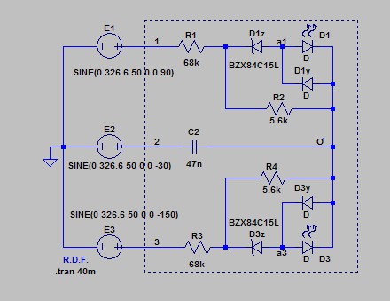 Viene in questo modo ad esistere una elevata differenza fra le tensioni di fase applicate ai due rami esterni che di conseguenza si avrà un'accensione dei due LED sicuramente aprezzabile e regolabile con un'opportuna scelta di R.