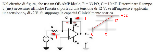 Dato che la corrente di carica è costante, il condensatore si caricherà con una rampa lineare ... che partendo da zero salirà fino a far saturare l'uscita v0 ad una tensione prossima, ma inferiore, alla Vcc ... si deve quindi supporre che la Vcc sia di alcuni volt ,almeno, superiore a 12V :!:
