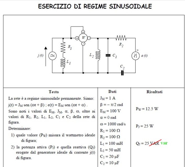 (non deve stupire una potenza reattiva positiva per S2, in quanto un facile calcolo potrebbe dimostrare che il generatore di tensione assorbe 25 var di porenza reattiva che sommati ai -12,5 var assorbiti da C2 porta al valore suddetto)