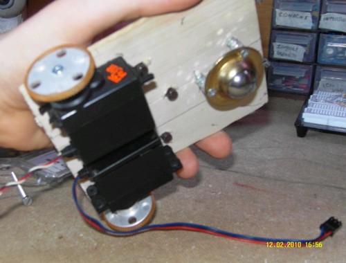 I due servomotori sono fissati ad un telaio in legno a cui è inoltre fissata una di quelle ruote libere di muoversi in ogni direzione ( ad esempio come quelle che probabilmente avete sotto la vostra sedia in questo momento :-)). il cambio di direzione è ottenuto bloccando un motore e facendo girare l'altro!