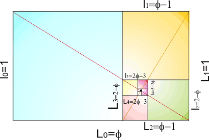 Se si costruisce un rettangolo aureo ad esempio l0 = 1 ed L0 = Φ, e si sottrarre da esso un quadrato di lato pari al lato più corto, si ottiene un nuovo rettangolo aureo di lati L1 = 1 ed l1 = Φ − 1. Il procedimento si può iterare all'infinito ottenendo rettangoli i cui lati si susseguono secondo la seguente tabella.