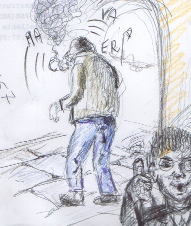 Il giovanotto, la bocca aperta ed il telefonino a mezz’aria, si guarda intorno stupito, alla ricerca della fonte sonora che gli ha indirizzato quell’invito. La individua nella figura curva che vede di schiena, quindi, girandosi verso gli avventori dei bar, cerca un sostegno morale alla sua dignità colpita sonoramente; sostegno che non trova perché tutti sembrano non aver udito nulla.