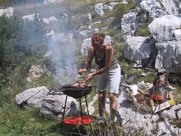 Nonostante l’assenza di acqua, la grigliata riesce benissimo. Bisogna vederla Marisa come si impegna a spostare e rigirare braciole e polenta, con le mani! Si scotta, dice che lei non sente niente, ma le cuoce in modo perfetto. Non è la prima volta, la conosco: così è quando prepara la grigliata nel nostro camino la notte di Capodanno, così è stato nel picnic a Gallio alcuni anni fa.