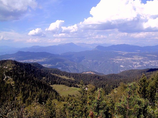 Insomma facciamo e vediamo tante cose ed il pomeriggio scorre sereno. Con la sera che avanza scendiamo a Tonezza. Dopo qualche errore e manovre impegnative (tipo la discesa in retromarcia della stretta stradina che affianca il villaggio dell’Aereonautica Militare), arriviamo nello spiazzo predisposto per i picnic. Avremmo dovuto arrivarci a mezzogiorno. Il posto, una conca circondata dai monti è molto bello, sono le otto (ora legale), ed è assolutamente quieto. La luce del tramonto colora il cielo e le vette ad est con un morbido vermiglione dorato. Nessuno siede ai tavoli del picnic, mentre con ogni probabilità a mezzogiorno erano completi. Ci siamo solo noi e prepariamo ottimi panini con prosciutto e Montasio.