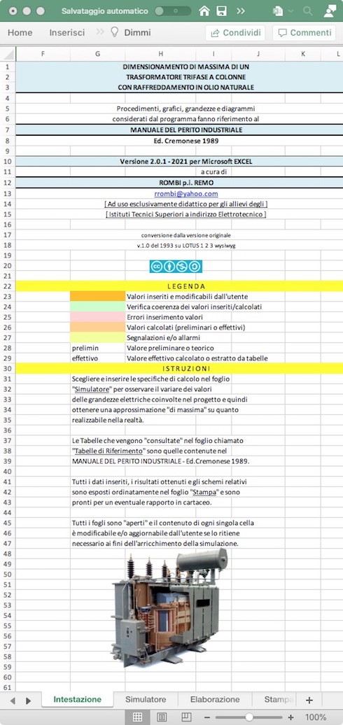 Sottopongo alla attenzione di tutti un foglio di calcolo, da me realizzato in EXCEL e CALC, che permette la simulazione del dimensionamento di massima di un Trasformatore Trifase a Colonne con raffreddamento in olio naturale.