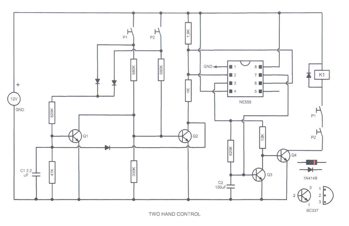 Se il secondo pulsante non viene premuto entro circa mezzo secondo Q1 si satura e porta a potenziale 0 la base di Q2. A questo punto occorre rilasciare il pulsante e ripetere il comando. Una volta saturo Q2 porta a potenziale 0 la base di Q1, che di conseguenza non può più attivarsi. Il relè torna a riposo dopo qualche secondo (dipende dal condensatore C2), in modo da obbligare l' operatore a ripetere il comando ad ogni ciclo. Anche se non indispenabili per il funzionamento (nel video non sono usati), i contatti in serie alla bobina ne impediscono l' attivazione spontanea in caso di guasto all' elettronica: sono quindi molto importanti per la sicurezza.