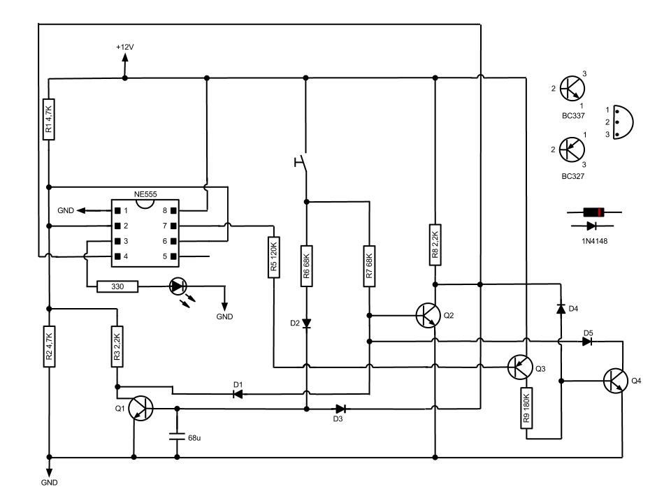 In questi giorni ho realizzato una possibile soluzione per pilotare l’ uscita di un NE555 con un solo pulsante. Circuiti di questo tipo vengono spesso usati in alternativa al relè passo-passo, col vantaggio che il relè si resetta anche quando viene tolta l’ alimentazione.Non appena alimentiamo il circuito ai pin 2 e 6 è presente una tensione di circa 6 Volt, di conseguenza l’ uscita rimane bassa. In questa condizione i transistor Q3 e Q4 sono alimentati tramite il pin7. Premendo il pulsante Q1 si satura con un piccolissimo ritardo, mentre la base di Q2 rimane bassa grazie al collettore di Q4. Non appena il condensatore si carica Q1 porta a livello basso la tensione ai pin 2 e 6, e al tempo stesso impedisce a Q2 di saturarsi. Rilasciando il pulsante il condensatore si scarica. A questo punto, dato che l’uscita del NE555 è a livallo alto, Q3 e Q4 risultano interdetti. Di conseguenza, non appena il pulsante viene premuto nuovamente, Q2 si satura e va ad azzerare il segnale al pin 4, mentre Q1 rimane basso. Il circuito ritorna quindi alla condizione iniziale.