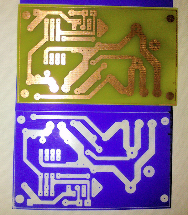 Dopo qualche minuto il PCB è pronto; con l'uso dei guanti prendere il PCB, risciacquarlo con acqua e togliere l'inchiostro della stampante con acetone.