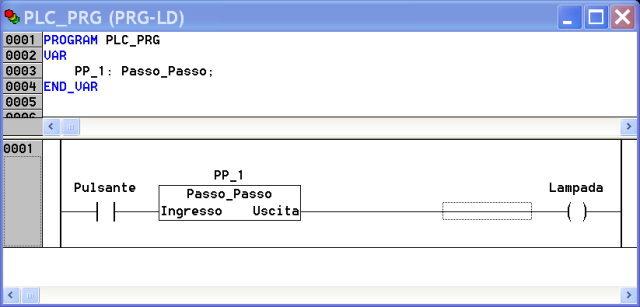 Ora non rimane che utilizzare questo blocco funzione in un programma applicativo di prova. Per prima cosa dichiariamo la necessità di far uso di tale componente. La dichiarazione di un'istanza di utilizzo del blocco equivale alla dichiarazione della struttura dati ram associata di cui parlavo in precedenza. Poi lo utilizziamo collegando all'ingresso il contatto Pulsante (nome simbolico che ho associato, nel PLC configuration, all'ingresso In_0) e collegando all'uscita la bobina del relè che accende la lampada (ho nominato col simbolo Lampada il bit di uscita fisica Out_0). Il listato applicativo, anch'esso in linguaggio ladder (ma il blocco funzione può essere utilizzato anche in programmi scritti con gli altri linguaggi) è il seguente: