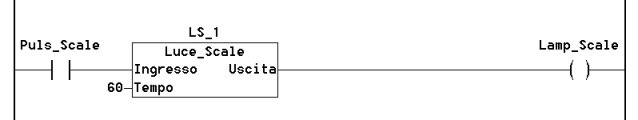 In questo esempio applicativo è stato nuovamente utilizzato il linguaggio grafico ladder che molto bene rappresenta lo schema elettrico di collegamento del luce-scale. Infatti l'ingresso In_1 del PLC (il successivo rimasto libero dopo l'esempio del passo-passo), ribattezzato col nome simbolico Puls_Scale attiva l'ingresso del luce-scale. L'uscita del dispositivo è poi connessa al relè di uscita Out_1 ribattezzato Lamp_Scale. Infine il blocco prevede come parametro di input il Tempo voluto di autospegnimento della luce, collegato in questo esempio alla costante 60 (secondi). Il valore di tempo tuttavia, invece che essere costante, può provenire da una variabile impostabile per esempio mediante l'interfaccia operatore con Web-server. In questo modo si può modificare il valore del tempo accedendo con un browser Internet alla pagina Web del quadro elettrico.
