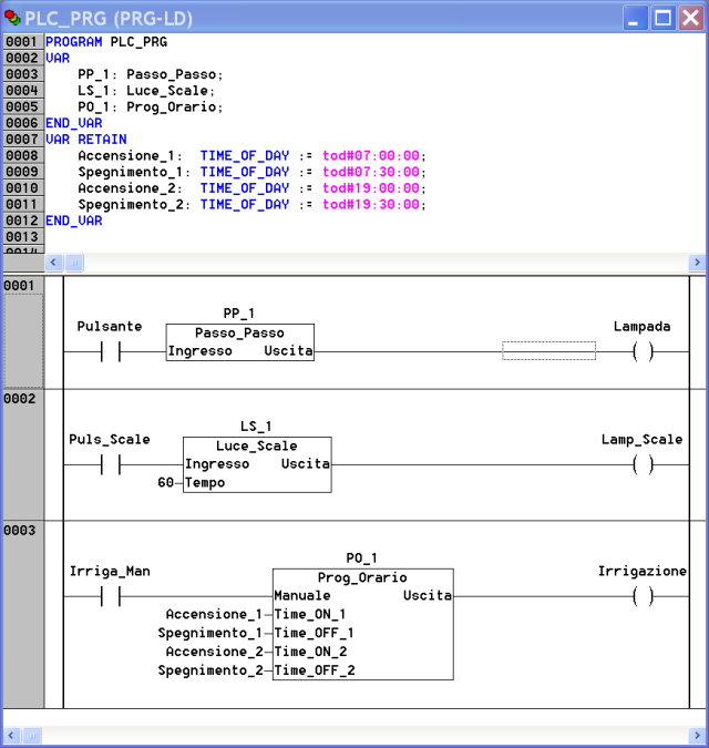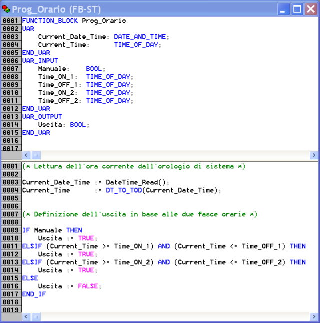 Un qualsiasi modulo programma è sempre diviso in due parti. In alto tutte le dichiarazioni delle variabili locali del modulo ed in basso il vero e proprio listato programma. Le dichiarazioni possono essere elencate ed editate sia nella forma di testo, come nell'esempio, sia in forma di tabella, divisa in righe per ogni variabile e in colonne per le relative specifiche. Le variabili sono poi suddivise in gruppi: variabili generiche locali, variabili di ingresso, di uscita e di tipo Retain, ossia a mantenimento del valore a PLC spento.