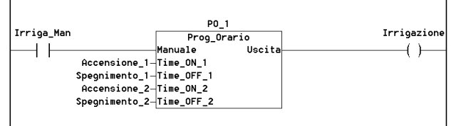 Ho definito il simbolo Irriga_Man per l'ingresso digitale su morsettiera In_2, passandolo come ingresso al blocco. Inoltre ho dichiarato quattro variabili di tipo TIME_OF_DAY nella memoria Retain, così non le perdo una volta editate col Web-server, passandole anch'esse come ingresso all'istanza di utilizzo del blocco funzione. Infine ho associato al relè di uscita Out_2 il simbolo Irrigazione e lo ho connesso all'uscita del blocco. Quindi il relè di uscita del PLC si accenderà tutti i giorni all'interno delle due fasce orarie programmate.