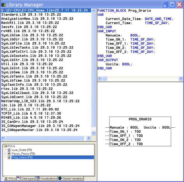 Per creare una nuova libreria basta partire da un qualsiasi progetto, lasciando solo le tre POU relative alla definizione dei blocchi funzione creati e salvando il progetto (Save As) come file .lib, appunto di libreria. In un futuro progetto poi basterà caricare con il Library Manager la nostra libreria:
